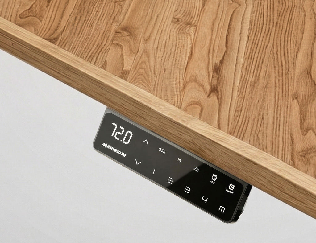 Motor eléctrico silencioso con memoria de posiciones: programa tu altura de trabajo sentado y de pie y cambia entre ellas al instante, sin esfuerzo. Rango completo de regulación: 62 cm a 125 cm. Estructura de acero estable, diseñada para soportar el peso del tablero macizo y todo tu equipo sin vibración.