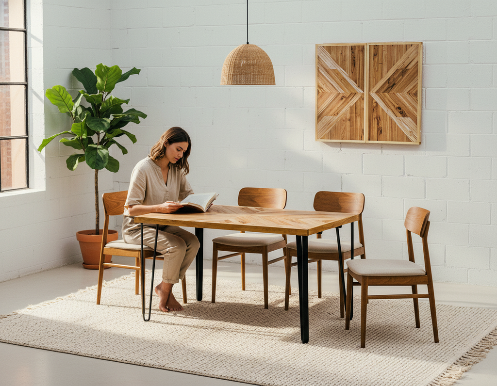 Esta artística y funcional mesa de comedor está hecha a mano con madera maciza sostenible de castaño y cerezo. Cada pieza de esta mesa de madera es cuidadosamente seleccionada teniendo en cuenta la veta, nudos y demás "imperfecciones" de la madera. Se tratan de manera 100% artesanal mediante diferentes técnicas mecánicas para darle esa textura y acabado único. Finalmente, aplicamos cuatro manos de aceite de alta protección para aportarle esa durabilidad y resistencia propias de una buena mesa de madera. La mesa queda totalmente protegida frente al desgaste, la humedad y las manchas que pudieran ocasionarse.